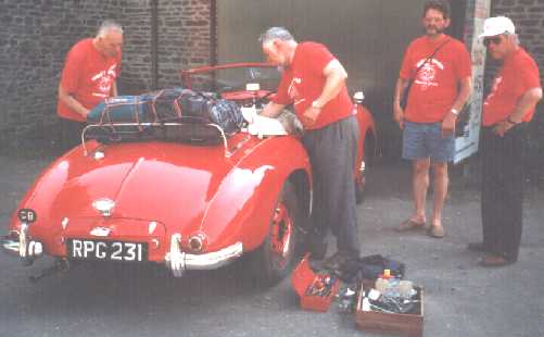 In the evening, the group stumbled on a local classic car rally in the neighbourhood of our Chartres base. None of the participants had even heard of a Jupiter, let alone seen one! One of them had a well -equipped workshop which enabled a broken gear lever to be welded. Heroically, Dennis Sparrow re-fitted it, working until midnight correcting other things he didn't like on this Jupiter. |